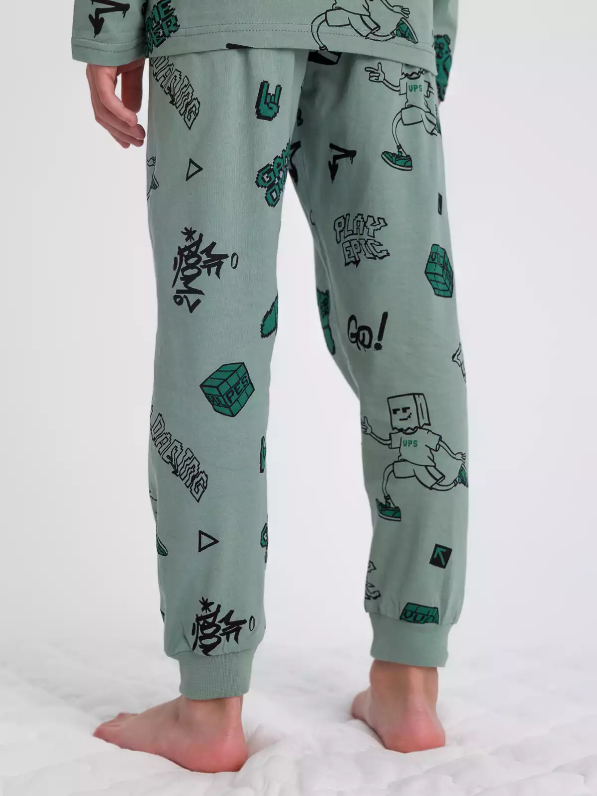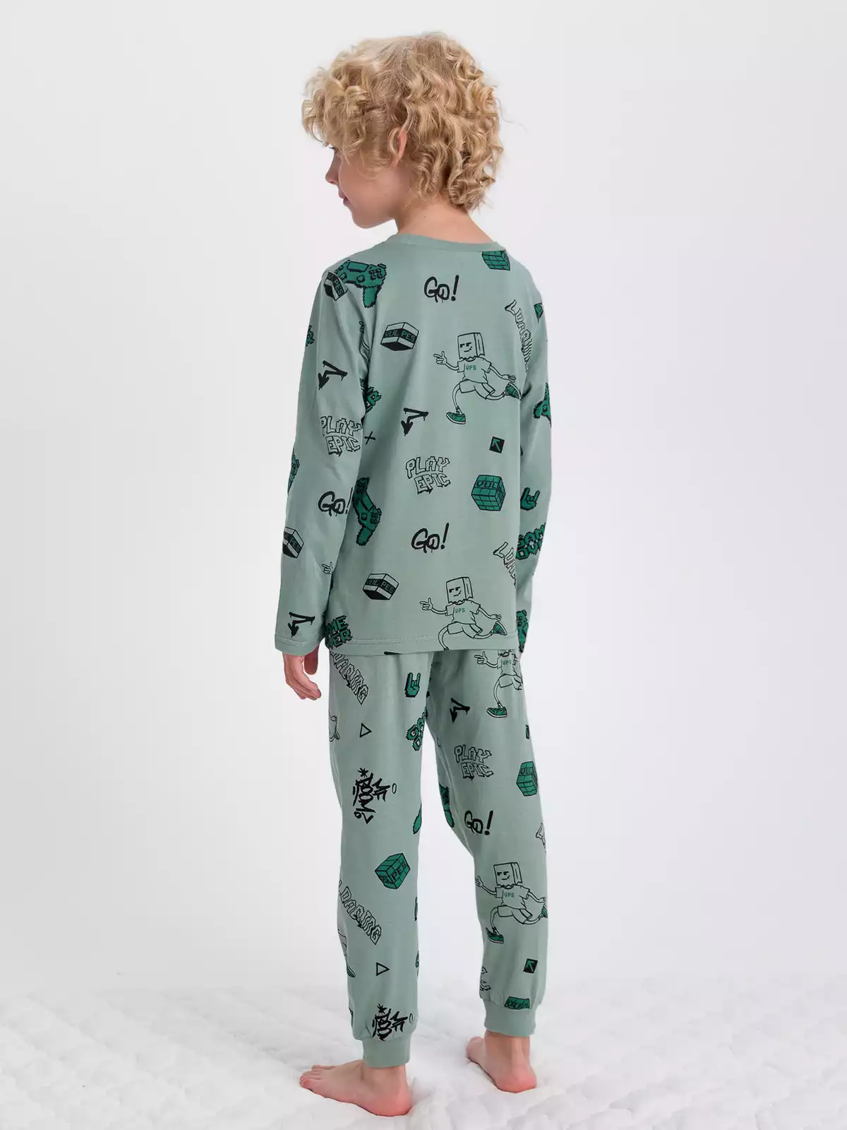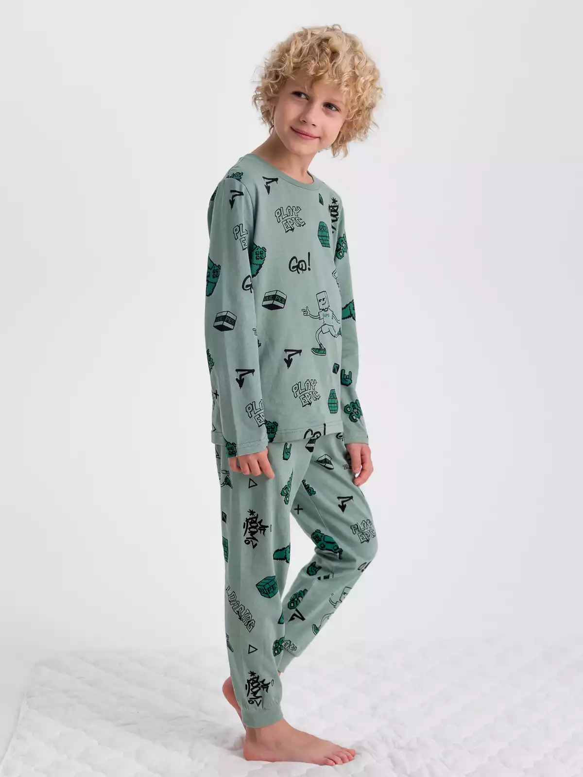 Пижама детская с длинными рукавами выполнена из натурального хлопка, она необычайно мягкая, легкая и не сковывает движения. Брюки на резинке по талии. Вся модель декорирована принтом. В такой стильной пижаме обеспечен комфортный и крепкий сон!