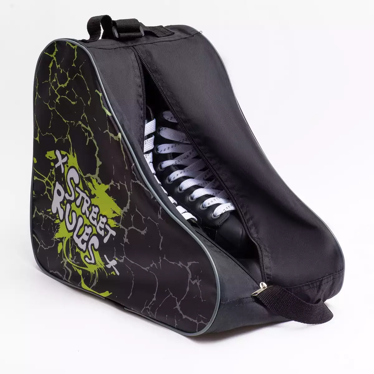 Сумка предназначена для переноски коньков и роликов. В сумку размера М входят коньки до 37 размера, размера XL до 41 включительно. Комплектуется регулируемой стропой для переноски, застёжкой-молнией. Сумка имеет отверстия-люверсы для вентиляции коньков после катания. Дно выполнено из ламинированного влагостойкого материала. Тент сумки - оксфорд с пропиткой ПВХ. Размер сумки в разложенном виде 39*31*21 см.