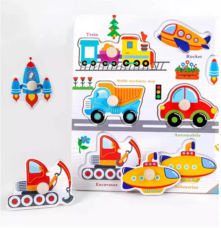 Игра представляет собой деревянную основу с рисунками-пазлами различных видов транспорта.