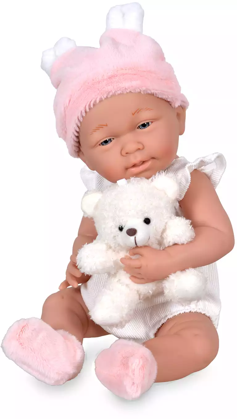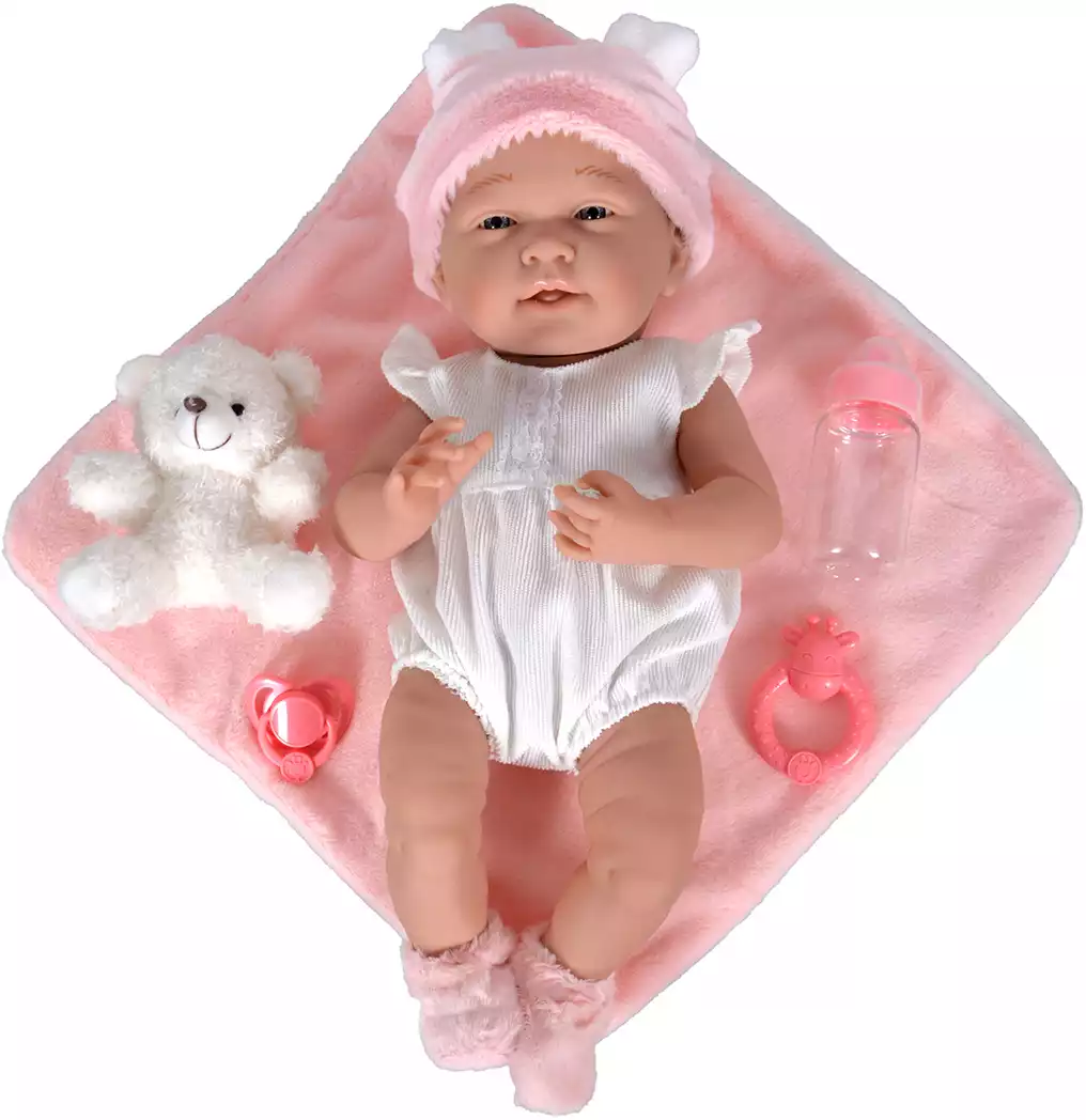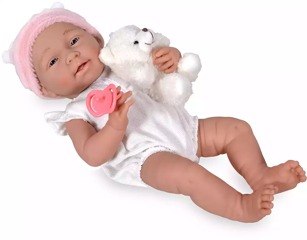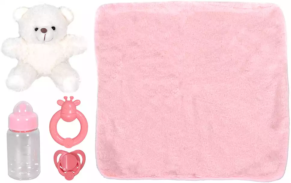 Пупс одет в белый боди, розовые пинетки, шапочку. В комплекте плед, плюшевый белый медведь и аксессуары для пупса,