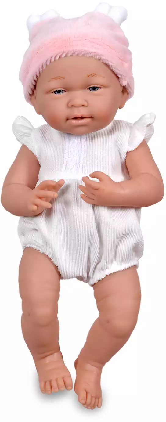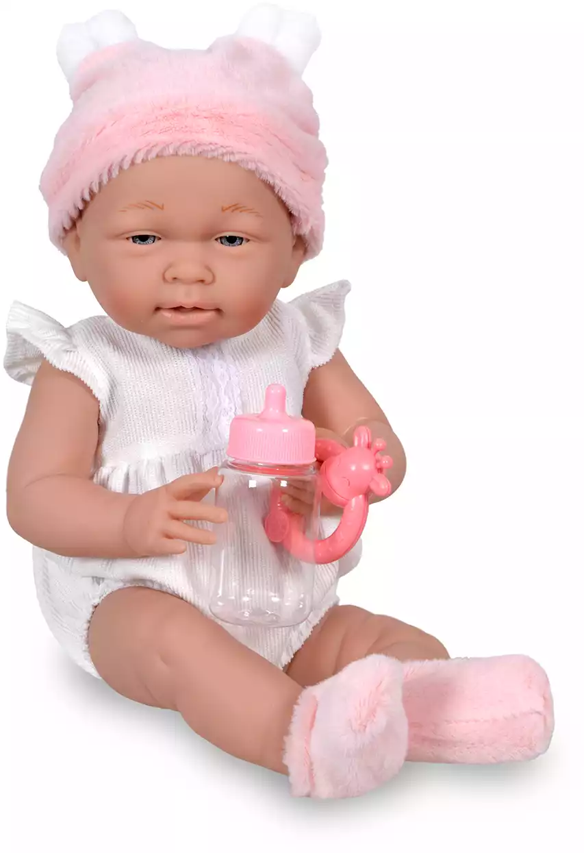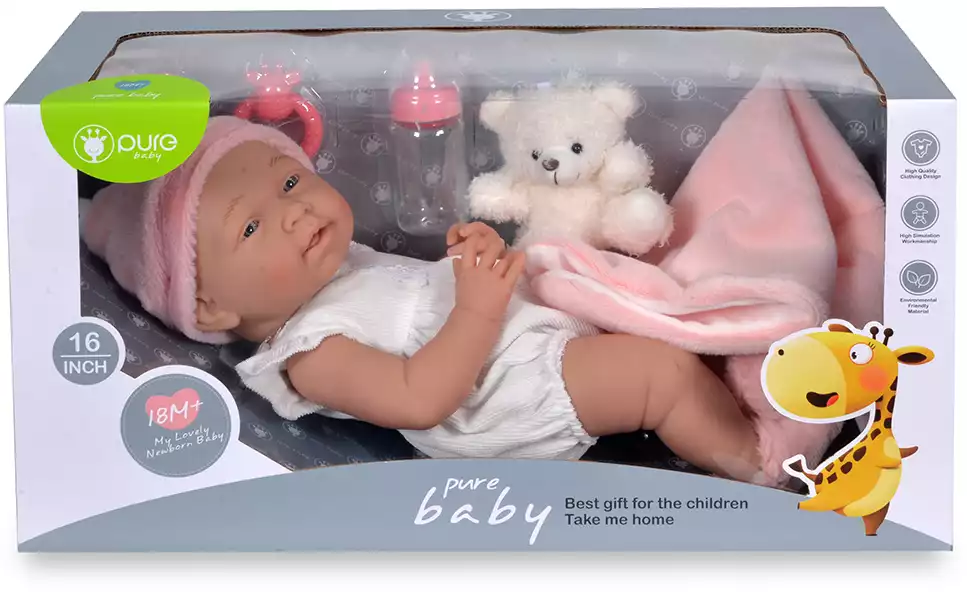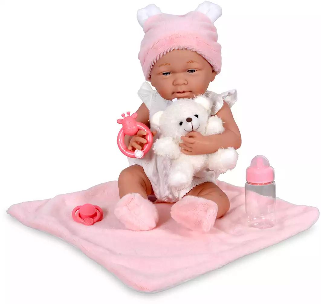 Пупс одет в белый боди, розовые пинетки, шапочку. В комплекте плед, плюшевый белый медведь и аксессуары для пупса,